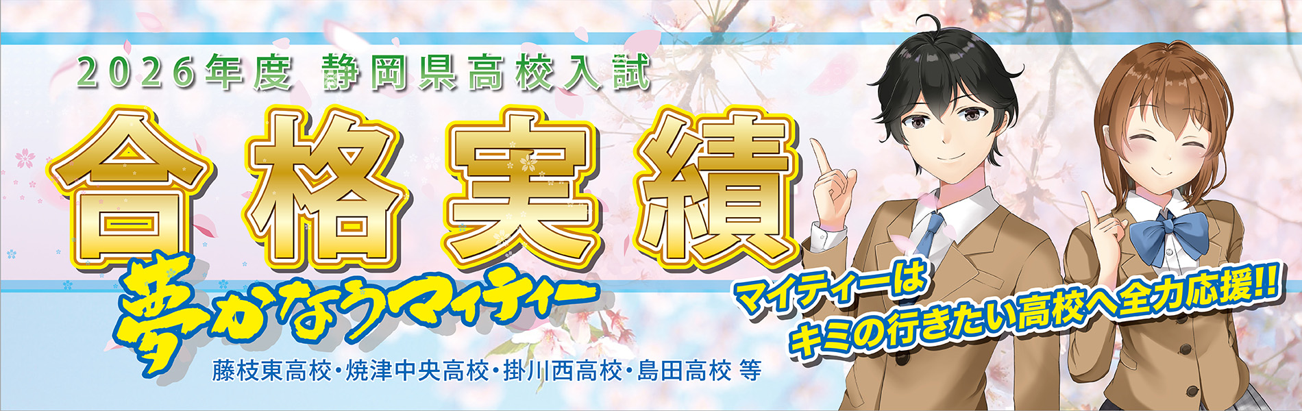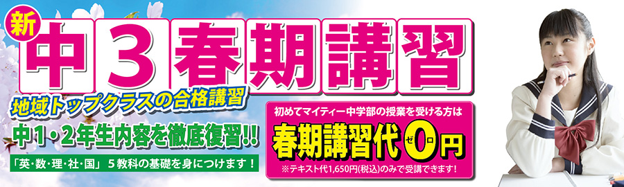 3月5日(水)、生憎の雨ですが、本日は静岡県の公立高校筆記試験の当日となりました。 マイティー進学院に通った中3生は、この日のためにマイティーで日々勉強を続けてきました。 本当にここまでよく頑張ってくれましたǴ […] - 2024 夏期講習開催!『夢は逃げない!逃げるのはいつも自分だ!』 今年も、圧倒的な量と質の夏期講習を開催いたします! 小学3年~6年・・・算数/国語 個別指導 英語/英会話 グループレッスン 中学12年・・・数国・英国・理社 […]