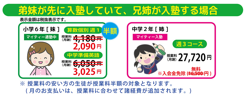 兄弟姉妹がマイティー進学院の在籍またはマイティー進学院の卒業生である場合には、入会金が全額免除となります。さらに、同時に通塾する場合は、授業料の少ないお子様の授業料が半額となります。