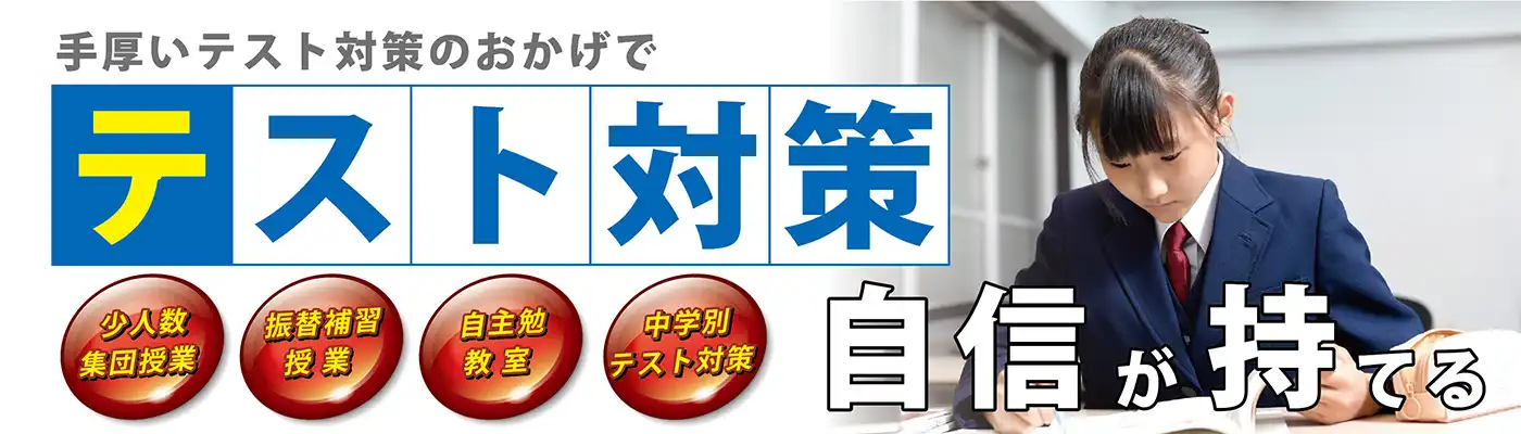 中学校の進度やテスト範囲にピッタリ合う授業がマイティーで勉強できます。中学校の定期テストは同じ市内であっても隣の地区の中学校とは試験日もテスト範囲も違うということがよくあります。そういった不安をマイティーでは解消できるので、テスト範囲の勉強に集中して取り組めます。その中学校で出やすい問題やテストを作る先生によるクセなども考慮したテスト対策問題集を解くことで、万全のテスト対策を用意しています。