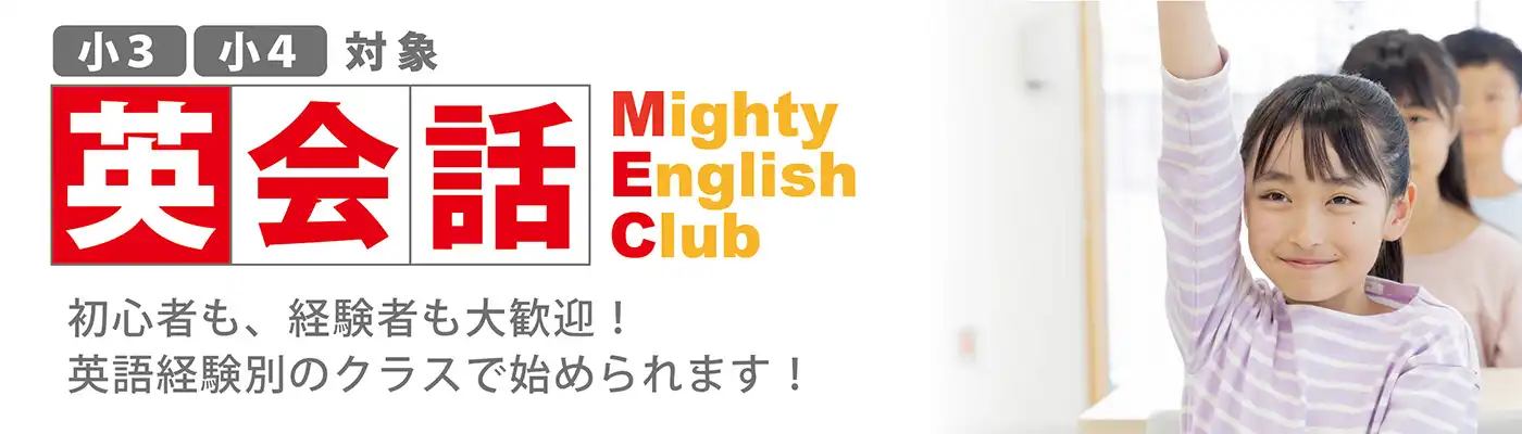 小学生から始める英語は、お子様によって始める年齢が異なります。小6で初めて英語をスタートする子もいれば、小1からスタートしているお子様もいるかもしれません。そこで、英会話コースでは学年に関係なく、英語経験の年数によって、2段階のクラス分けにしています。他塾で何年か英語をやっていたお子様も、マイティーで初めて英語を勉強しようとしているお子様も、安心してお子様のレベルに合わせた英語授業でスタートすることができます。
